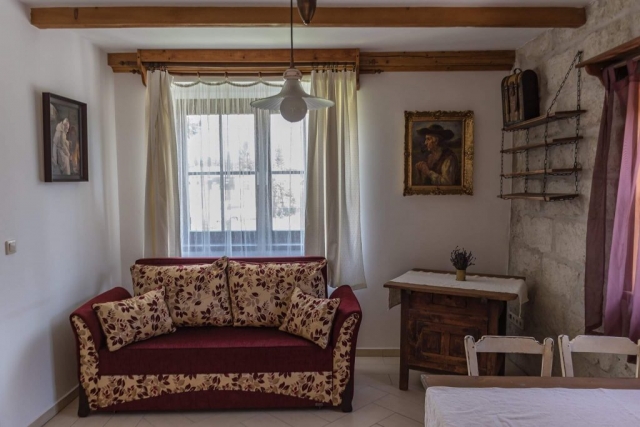 A hálószobában egy franciaágy, és egy heverő, a nappaliban pedig egy kihúzható kanapéágy található.